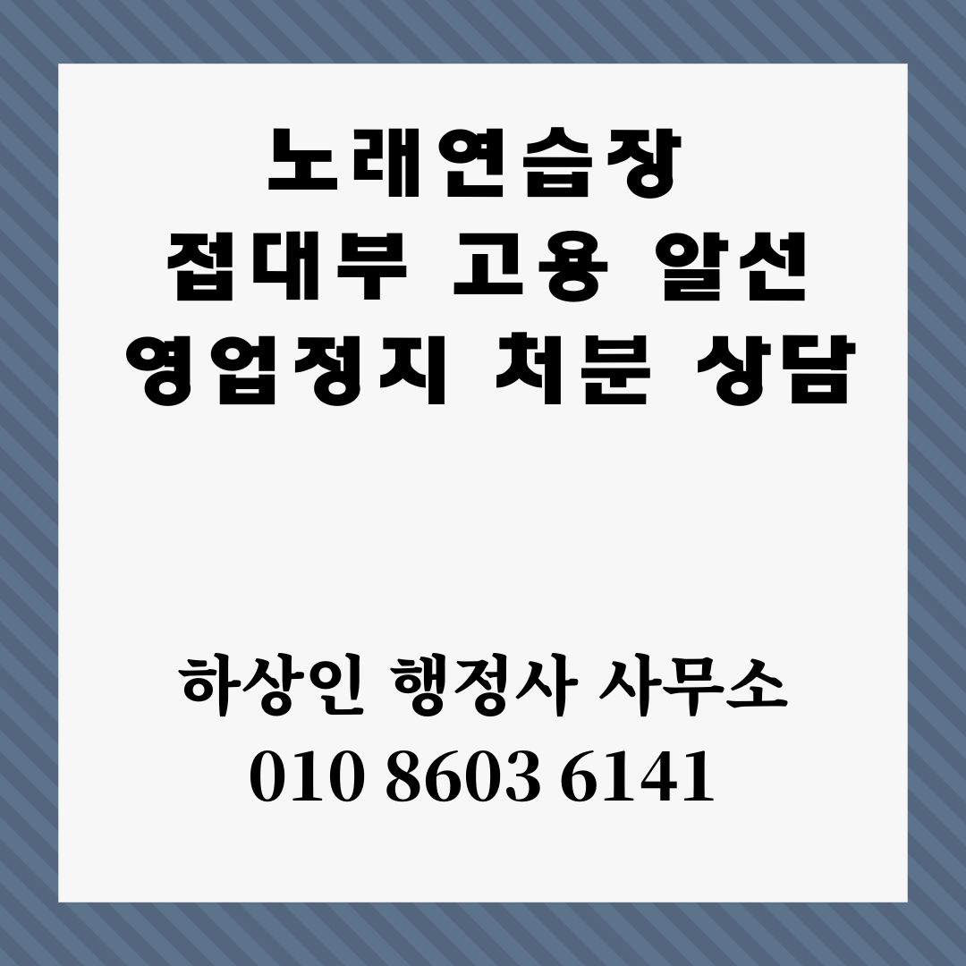 노래연습장에서 접대부 고용, 알선행위로 적발되어 영업정지 처분에 관한 의견제출서 작성이나 행정심판 청구 문의가 있는 경우 저희 하상인 행정사 사무소로 연락 남겨주시면 되겠습니다.