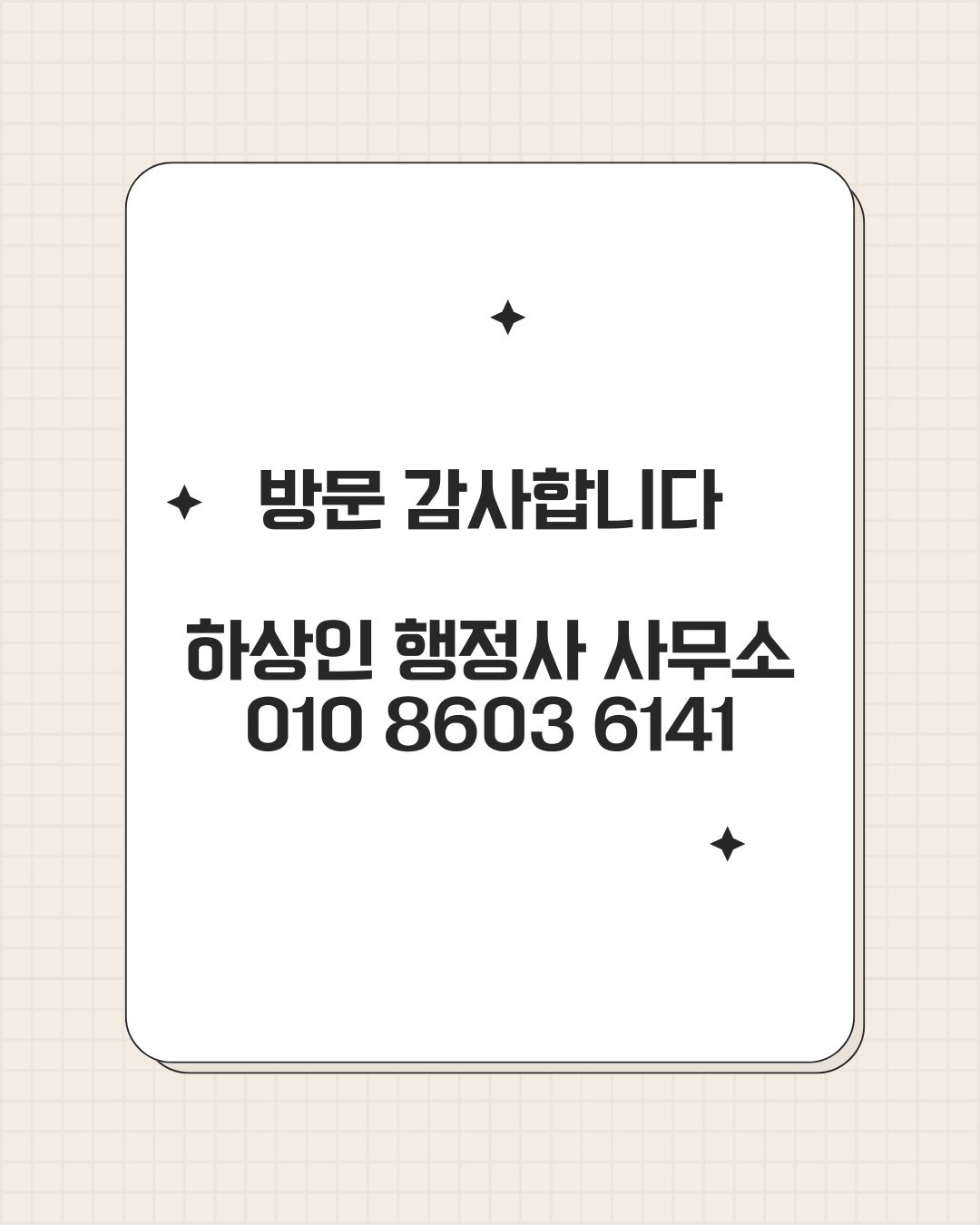 참고하시면 되겠으며 관련 상담이나 서류 작성 대행 등 문의가 있는 경우 저희 하상인 행정사 사무소로 연락 남겨주시면 되겠습니다.