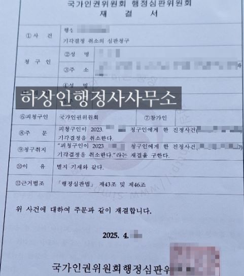 인권침해를 당하여 진정하였으나 기각된 국내 체류 중인 외국인이 이에 불복하여 행정심판을 청구하고자 저희 하상인 행정사 사무소를 찾아주셨습니다. 그리고 꽤나 오랜 시간(약 1년)이 소요되어 기각 결정을 취소하라는 저희의 청구가 그대로 받아들여지며 구제가 되었습니다.